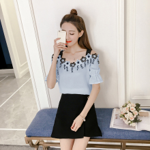 2017夏装新款韩版吊带荷叶边露肩短袖一字领上衣宽松百搭雪纺衫女