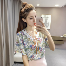 2017夏装新款韩版短袖圆领碎花雪纺衫宽松气质百搭系带荷叶边上衣