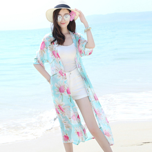 夏季新款女装沙滩雪纺中长款开衫真口袋卷边领中袖薄款百搭防晒衣