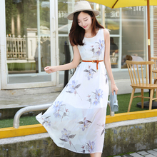 2017夏季女装新款印花腰带雪纺无袖大码大摆长款沙滩连衣裙沙滩裙