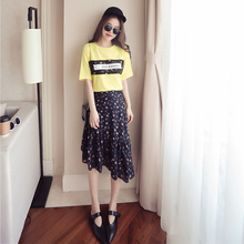 大码女装胖mm春夏新款百搭字母短袖T恤碎花雪纺半身裙200斤两件套