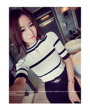 夏秋季新款韩版黑白条纹短款针织衫修身显瘦百搭上衣女短袖T恤