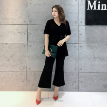 大码女装夏季新款黑色收腰套装显瘦两件套加大上衣+喇叭裤女4123
