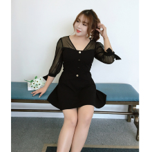 2017春装新款大码女装胖mm修身雪纺裙V领欧根纱高腰A字连衣裙A192