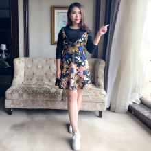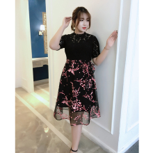 现货春季大码女装胖mm刺绣印花连衣裙气质收腰蕾丝拼接雪纺裙4220