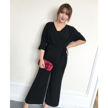 2017春季新款女裤胖mm修身阔腿裤显瘦长袖v领大码连体裤高腰1804