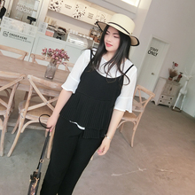 2017大码韩版新款女装胖MM收腰显瘦雪纺衫吊带九分裤三件套夏时尚