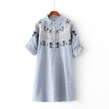 2017韩版大码新款女装胖妹妹显瘦条纹刺绣中长衬衫长袖连衣裙春潮