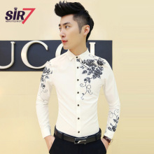 中国风春季印花衬衫男长袖修身款韩版潮流男士衬衣休闲白衬衫男装