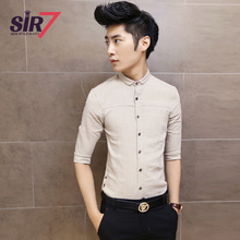 夏季衬衫男短袖韩版修身七分袖亚麻衬衫男士中袖夏天纯色休闲衬衣