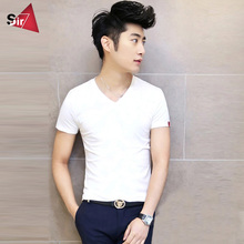 夏季男士短袖t恤男韩版修身潮流男装纯色v领衣服男夏天白色打底衫