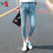 韩版男士牛仔裤春夏季九分裤潮男裤子修身型小脚裤浅色9分裤潮流