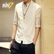 中国风盘扣亚麻衬衫男七分袖春夏季修身款棉麻料中袖衬衣男士上衣