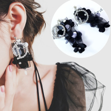 日韩国 时尚设计款夸张甜美蕾丝珍珠黑星星链条织带金属耳环耳钉