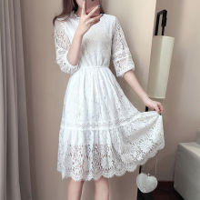 2017春季新款女装中长款甜美仙女裙子七分袖高腰白色蕾丝连衣裙潮