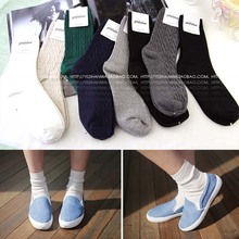 韩国代购袜子 15秋女袜纯棉中筒短棉袜 简约纯色竖纹堆堆袜黑