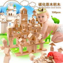 100粒桶装大块环保无漆原木木制碳化积木玩具1-6周岁儿童益智拼搭