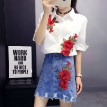刺绣衬衫女短袖2017春夏装新款韩版宽松纯棉白色翻领韩范衬衣潮