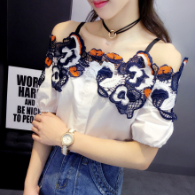 2017春夏装新款韩范刺绣衬衫女上衣 一字领露肩衬衫女宽松衬衣潮