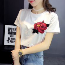 2017夏季学生短袖t恤女半袖玫瑰花刺绣上衣宽松白色体恤打底衫潮