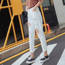 2017夏季新款高腰破洞做旧九分牛仔裤修身显瘦卷边直筒裤子女学生