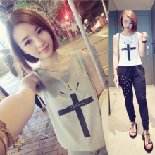 2016春夏装新款韩版十字架印花学生无袖打底背心吊带t恤衫女上衣
