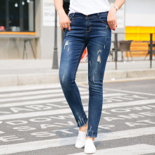 帆布蕾丝大码女装个性磨破修身牛仔弹力磨白小脚裤