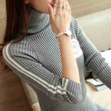 秋装新品韩版半高领针织衫修身竖条纹长袖套头打底衫毛衣女
