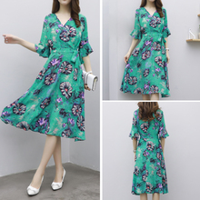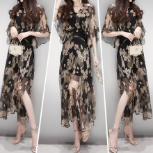 2017新款连衣裙女装夏装韩版修身V领高腰真丝雪纺印花中长裙潮