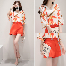 名媛2017夏季女套装显瘦百搭印花V领上衣短裤阔腿裤时尚两件套潮