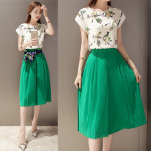 2017夏装新款 韩版女装t恤上衣+绿色百褶七分裤裙裤阔腿裤套装女