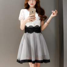 2017春装新款 韩版女装圆领白色蕾丝上衣拼接网纱欧根纱连衣裙女