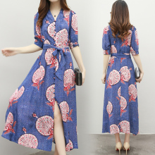 2017夏装新款印花雪纺长款V领中袖腰带修身显瘦女装长裙连衣裙女