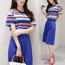 2017夏装新款韩版明星同款名媛条纹短袖七分裤阔腿裤两件套套装女