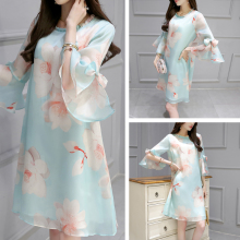 2017春季新款雪纺印花裙子V领喇叭袖腰带修身显瘦气质连衣裙女夏