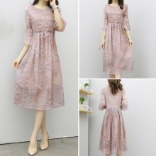 2017春夏新款女装时尚显瘦中长款韩版蕾丝喇叭袖圆领淑女连衣裙潮