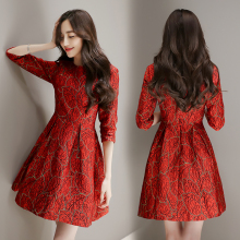 2017早春装韩版女装新款气质收腰红色提花A字打底裙短裙连衣裙女