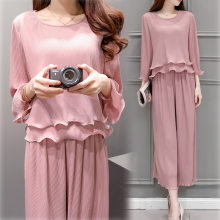 2017春夏新款圆领上阔腿裤韩版两件套褶皱宽松休闲时尚套装潮女装