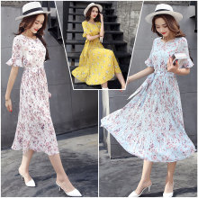2017夏装新款女装韩版修身显瘦气质喇叭袖雪纺荷叶边碎花连衣裙女