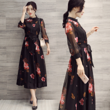 2017新款女装韩版春装连衣裙七分袖长款印花雪纺裙高腰大摆长裙女