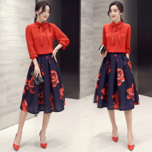 2017春装女装韩版新款两件套印花裙子时尚名媛套装修身连衣裙女潮