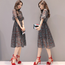 2017夏季新款女装韩版气质短袖修身裙子中长款印花雪纺连衣裙女潮