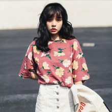 卡贝斯薇2017夏装新款韩版文艺范印花棉麻短袖T恤女宽松学生上衣