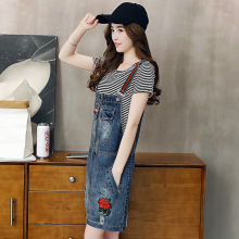 牛仔背带裙女中长款2017新款夏季韩版刺绣牛仔连衣裙时尚学生套装