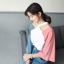 2017春夏季新款韩版撞色拼接露肩T恤女宽松中袖挂脖体恤打底上衣