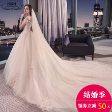 婚纱礼服新娘一字肩长拖尾2017新款韩式齐地彩纱公主拖尾婚纱