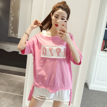 夏装新款韩版中长款短袖T恤女学生印花半袖体恤假两件露肩上衣潮