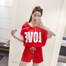 夏装新款韩版印花短袖连帽卫衣时尚两件套休闲短裤学生运动套装女