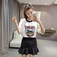 春夏季新款韩版学生印花短袖T恤休闲套装女荷叶边短裙时尚两件套
