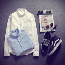男士休闲长袖牛津纺绣花白衬衫韩版修身纯色衬衣绣花男衬衫男衬衣
